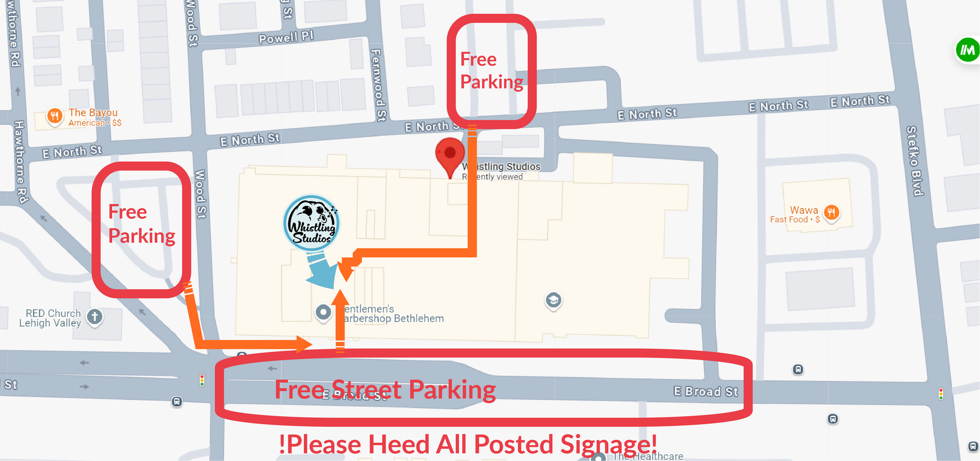 When you come to the studio, you'll discover there is not yet signage for my space on the exterior of the building. Look for a very large brick structure, with signage that reads "Laros Lofts." You can enter from the rear on North Street, where there is a large parking lot available. Or you can enter from the front on Broad Street, where there is ample street parking. If entering from North Street, navigate through the large lobby with the neon sign that reads "Laros Lofts." You'll then follow the hallway down past the elevators, past a few narrow left and right turns, until you go down a left turn into my hallway. Whistling Studios is Suite 112 on the right. If entering from Broad Street, enter through the doors just to the right of the Barbershop. Enter the first floor hallway on the right and find my studio as the first Suite on the left.